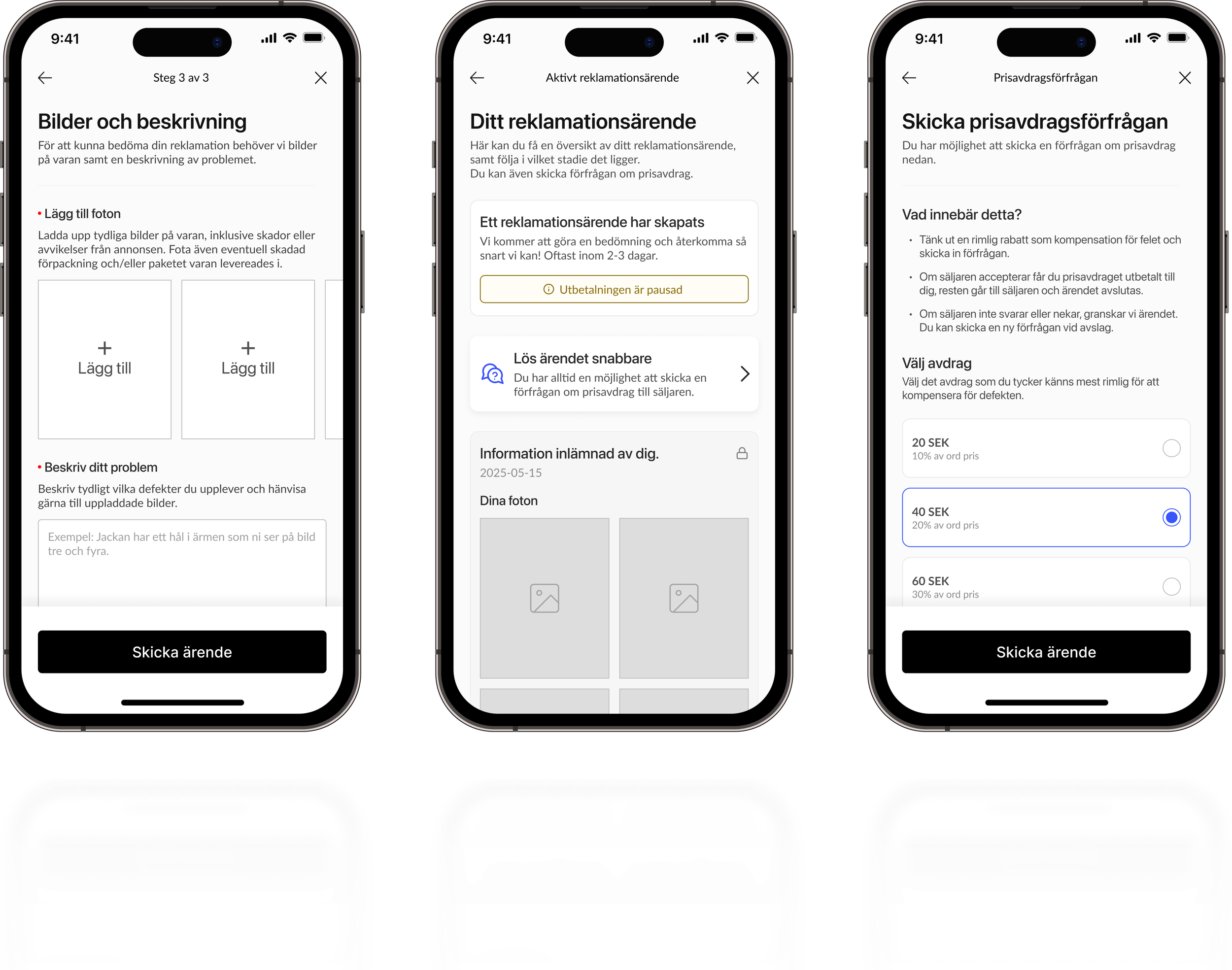 Previously, all claims were handled manually via support chat, where support had to collect information from both buyer and seller. Resolutions, such as partial refunds, often happened outside the platform via Swish. This way of working was time-consuming, hard to get an overview of, and could be made more efficient – both for users and the support team.